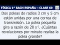 Dos poleas de radios 3 cm y 5 cm están unidas por una correa de transmisión. La polea pequeña gira a razón de 20 s-1. ¿Cuántas revoluciones por minuto realiza la polea grande?